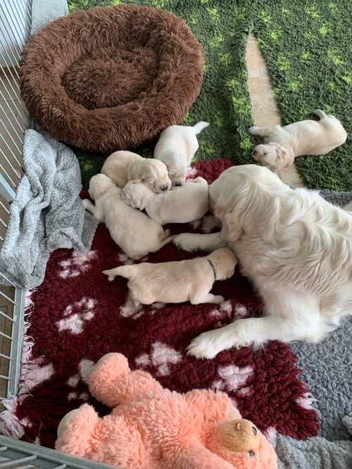 Seit dem 16.05.22 haben wir 5 Hündinnen und 5 Rüden .Vicky ist eine tolle Mama und bisher läuft alles gut.
