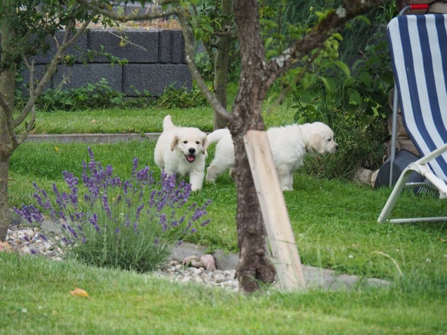 wir sind jetzt 5 Wochen alt und haben unser Welpenhaus tagsüber bezogen.