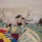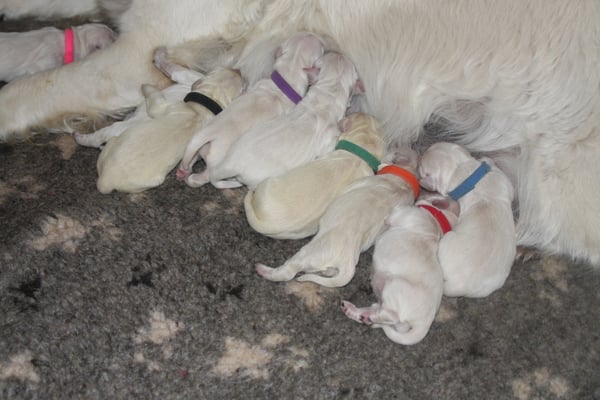 Den Welpen und Lilli geht es gut. Sie haben alle zugenommen und sind munter. Lilli versorgt ihre Welpen wie gewohnt sehr liebevoll und verlässt die Wurfkiste nur sehr ungern. Die beiden Welpen, die etwas "Farbe" haben, sind auch sehr hell, sie haben aber durch das Fruchtwasser einen leichten Grünstich der in den nächsten Tagen wieder verschwindet.