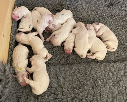 Die Welpen sind 5 Wochen alt und bei schönstem Herbstwetter draußen. Mila passt auf.